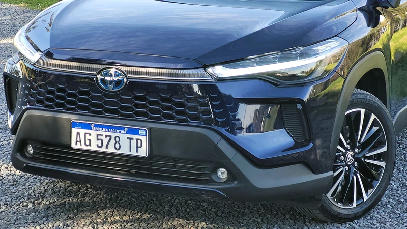 Puntualmente el Corolla Cross deja de lado la parrilla grande, estilo boca de pez, y la reemplazó por una pieza que única, sin marco o ruptura de continuidad con el frontal, permitiendo el paso de aire mediante perforaciones hexagonales.